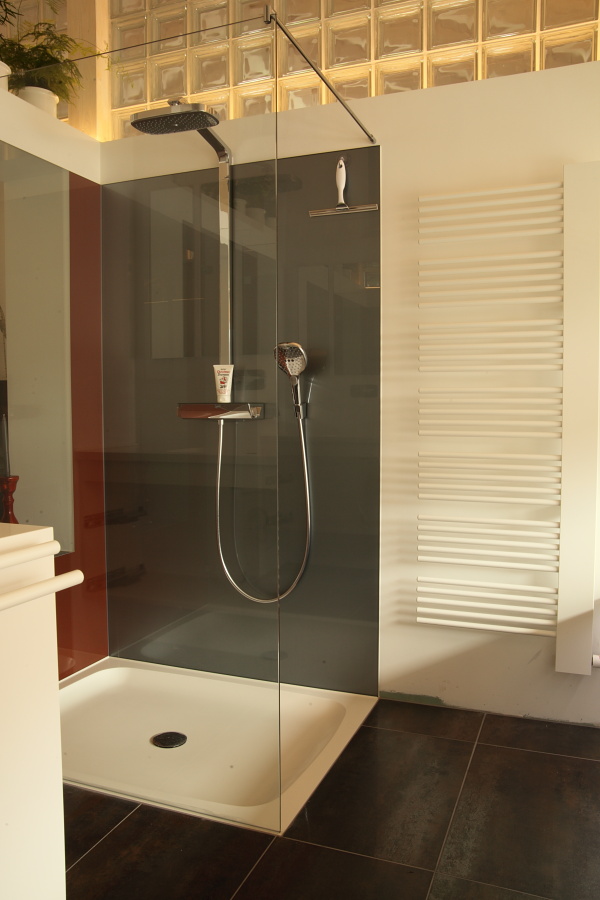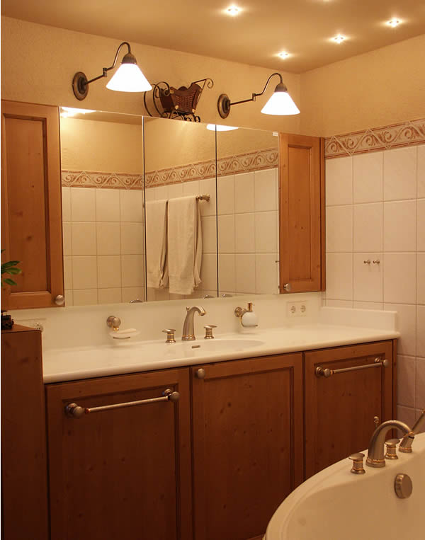 Spiegelschrank ist in die Trockenbauwand eingearbeitet. LED-Licht mit Leuchtkörpern aus Mineralwerkstoff. |